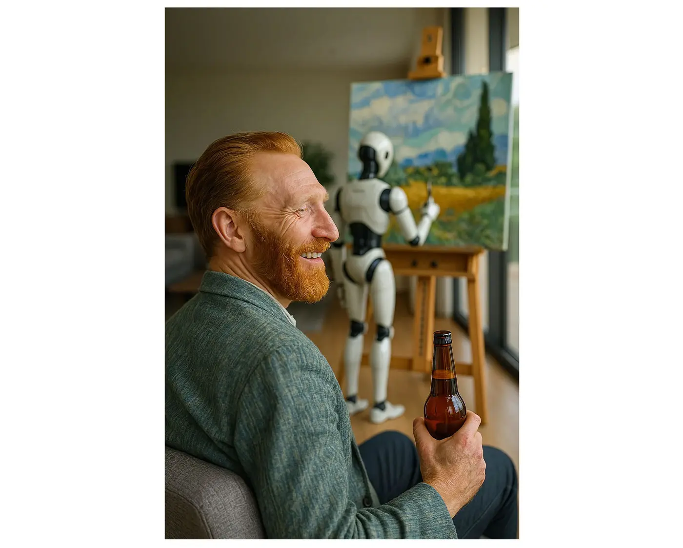 Source: Sora, with prompt: Vincent van Gogh seen from behind. We can see his red beard and hair. He is smiling, sitting in his modern luxury apartment, looking at a standing, emotionless, sophisticated humanoid robot painting a version of “A Wheatfield, with Cypresses” in the background. The background is a bit out of focus. Ultra-realistic, sharp, colorful photograph.